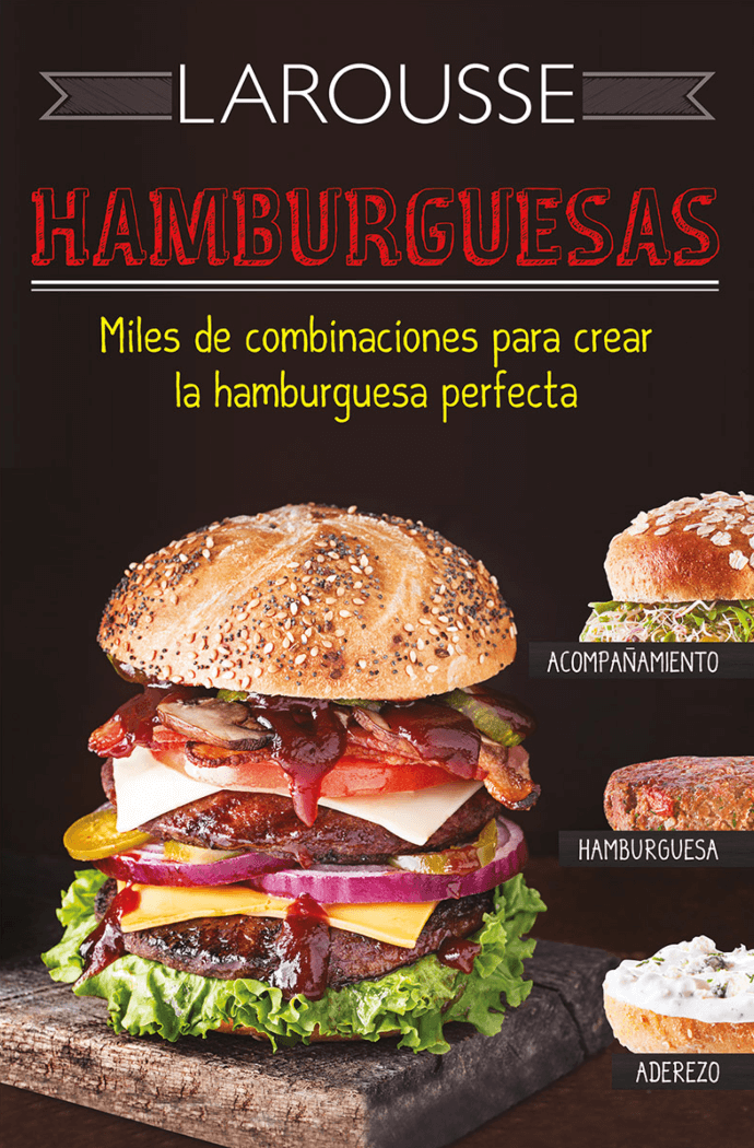 "Hamburguesas", de Larousse, es un libro interactivo de recetas de cocina para preparar hamburguesas únicas con más de 1000 combinaciones posibles. Las páginas interactivas pueden combinarse al gusto eligiendo entre diferentes panes, aderezos, acompañamientos y carnes. Incluye hamburguesas de res, cordero, pollo, pavo, pescado, camarón y opciones vegetarianas; además, recetas de bollos suaves y esponjosos, así como de las salsas indispensables para hamburguesas clásicas y otras que ofrecen giros inesperados de sabor. También podrás encontrar acompañamientos de fritura, como aros de cebolla, gajos de aguacate fritos o papa paja, o bien, puedes optar por reparaciones frescas, como ensalada de pepino y jengibre, tzatziki o ensalada de papa; además de algunas preparaciones clásicas, como macarrones con queso, rajas con crema o esquites con mayonesa y queso. Estas deliciosas recetas se pueden acompañar con deliciosos aderezos cremosos o a base de queso, como el de jocoque con menta, de cuatro quesos o de queso azul; mayonesas y alilolis. También aderezos clásicos, como chimichurri, salsa barbecue o salsa tártara. Contiene procedimientos sencillos con ingredientes fáciles de obtener. Además de recetas complementarias de bollos para hamburguesa, salsa cátsup, salsa teriyaki y mayonesa, ¡y un apartado interactivo con excelentes sugerencias de ricas combinaciones!