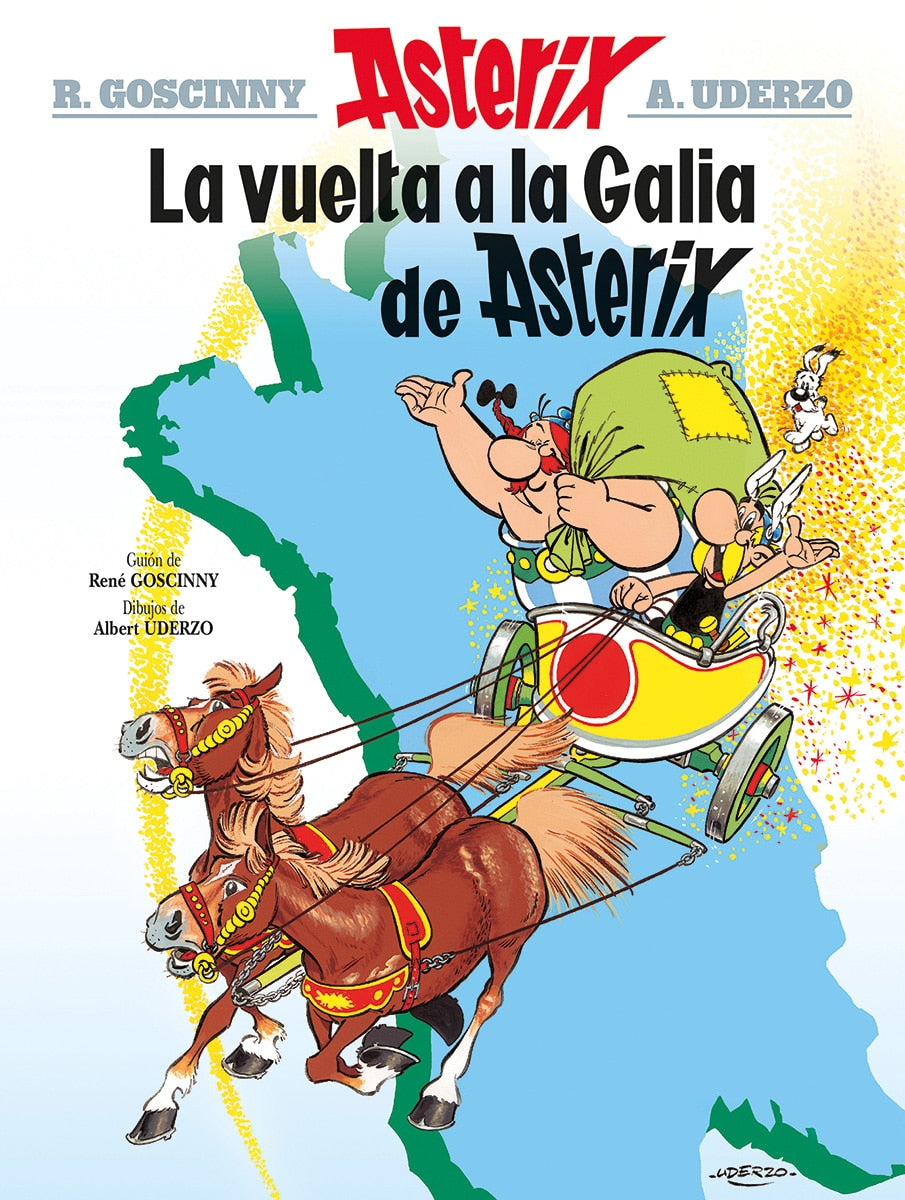 La vuelta a la Galia de Asterix El campamento romano de Petibonum recibe la visita del inspector Lucilius Flordelotus, enviado especial de Julio César, quien está irritado porque la aldea gala es la única que no vive en la paz romana, por lo que el inspector decide hacer que el campamento romano ataque la aldea gala. Los romanos deciden atacar renuentemente, a pesar de temerles a los galos por estar dotados de una fuerza mágica. Asterix y Obelix al enterarse de esto, previenen a la aldea, quienes dotados por la fuerza mágica, logran derrotar a los romanos. El inspector, sin embargo, decide construir una empalizada alrededor de la aldea para evitar que hagan que el resto de la Galia se rebele en contra de las fuerzas del César. Sin embargo, Asterix decide hacerle una apuesta al inspector, que consiste en que ellos salgan de la aldea a pesar de su empalizada y volverán con una especialidad de cada región para celebrar un banquete al que el inspector está invitado. El inspector por su parte. acepta la apuesta y además, si los galos ganan, promete levantar el sitio y reconocer su derrota ante Julio César. Un intento de los romanos por retener a los galos en el interior de su aldea deriva en una apuesta: Asterix y Obelix deberán recorrer los lugares más significativos de la Galia y traer un recuerdo de cada uno. Los romanos harán todo lo posible por evitar que logren su objetivo y les pondrán todo tipo de obstáculos. Esta aventura les permite, así como al lector, conocer la Galia en tiempos del Imperio romano: Lutecia (París), Massilia (Marsella) y Tolosa (Toulouse), entre muchas otras ciudades que aún hoy en día están incluidas en algunos tours alrededor de Francia Asterix regresa para entretenernos con otra de sus grandes aventuras, es la historieta francesa más reconocida a nivel mundial, creada por el guionista René Goscinny y el dibujante Albert Uderzo, se ha traducido a más de 11 idiomas y dialectos incluyendo latín y griego antiguo y ha vendido más de vendido 380 millones de ejemplares.